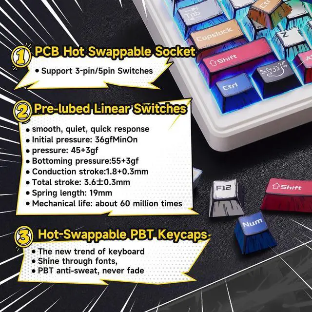 Hot-swappable Custom Creamy Keyboard: The switches and keycaps can be freely replaced(keycap/switch puller are included in the package). This customizable keyboard with hot-swap PCB allows users to replace 3 pins or 5 pins switches easily without soldering issue, even persanal keyboard beginners can easily DIY there own keyboards. F99 mechanical keyboards equipped with pre-lubricated stabilizers and Star axis, bring smooth and pleasant creamy mechanical sound, provide fast response for games.