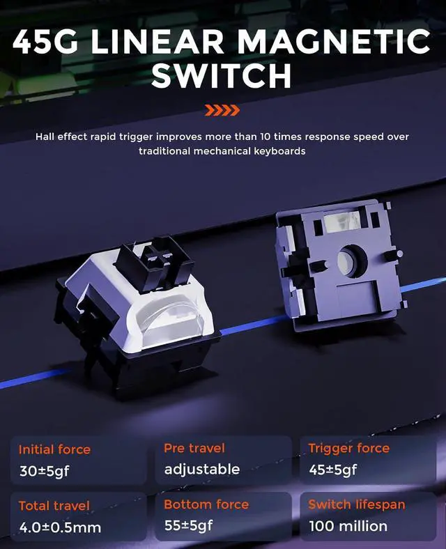 RAPID TRIGGER & DYNAMIC KEYSTROKES- This Hall effect keyboard eliminates the physical delay of traditional mechanical switches, providing 20 times faster accuracy and 11 times faster response than traditional mechanical keyboards. Compared to most 2-in-1 action key keyboards on the market, we can program up to 4 different commands in the same key, bringing you better combat power in fast-paced or combo attack games.