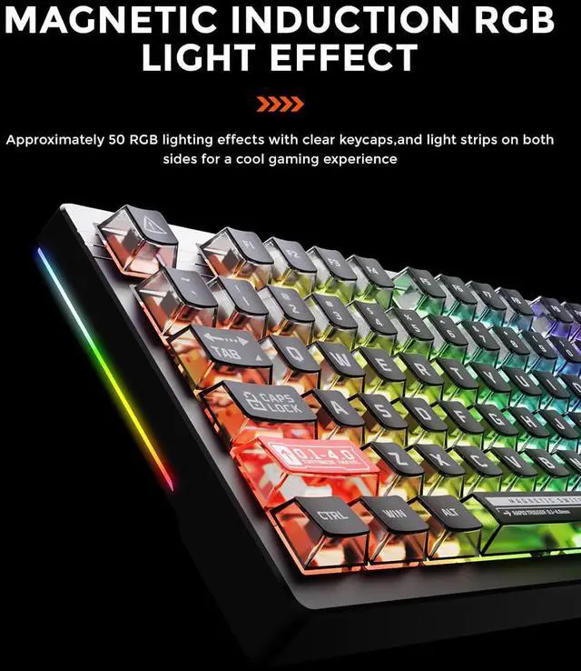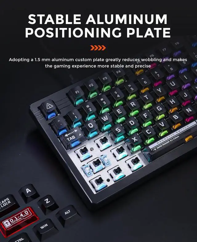 MAGNETIC SENSING RGB &ESPORTS READY - The backlight of the RGB gaming keyboard can be changed according to the strength of the Hall effect, the transparent keycap with a light guide for vivid and colorful RGB illumination flows freely, and more than 50 kinds of RGB light effects for you to choose at will. TKL form factor but full-size functionality, 1.5 mm aluminum positioning plate greatly reduces wobble.