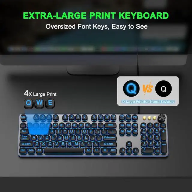 Large Print Backlit Keyboard: Effortlessly locate any key on our large key backlit keyboard. It is designed with print 4x larger than on traditional keyboards to help you type confidently. Ideal for seniors, students, office workers, elderly, the visually impaired, schools, special needs departments and libraries, as well as companies.