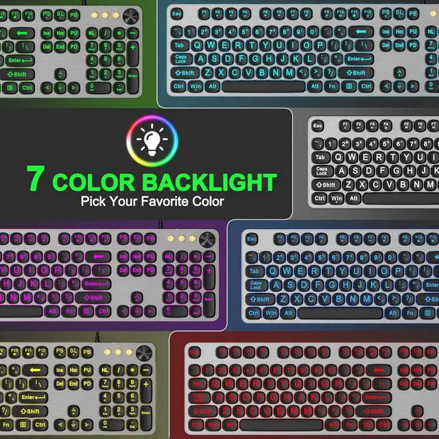 Large Print Backlit Keyboard with 7-Color Backlit, Wired USB Lighted Computer Keyboards Oversize Letters Keys Easy to See, Illuminated Keyboard for PC, Laptop,Windows Desktop