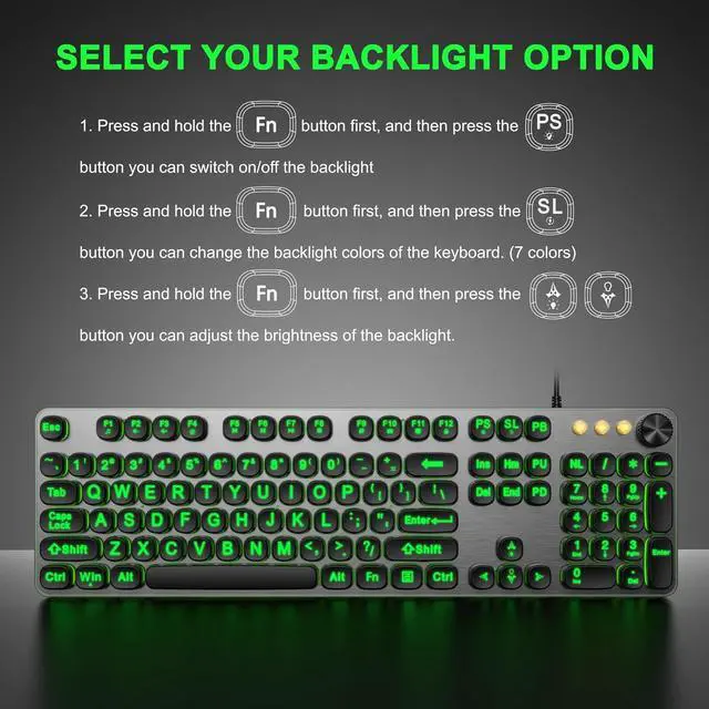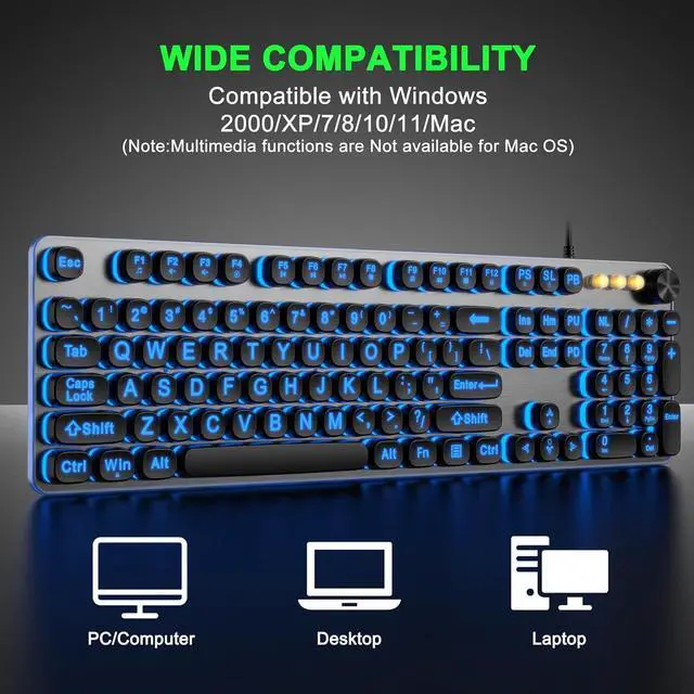 Blending Retro With Multimedia Control Knob Keyboard: Equipped with a convenient multimedia control knob, this backlit keyboard allows you to easily adjust the volume and mute the computer with a simple twist or press. A sleek, modern design with round raised keycaps and spill-resistant technology, this typewriter light up keyboard helps you stand out in the office.