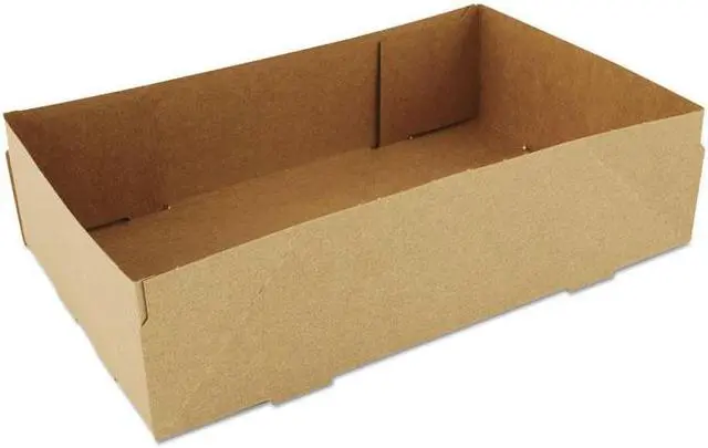 Convenient, space-saving, store-flat trays pop-open when needed, enabling quick order completion. Spacious interior accommodates full meals: both food and drink. Sturdy kraft construction with double-ply corners helps ensure trouble-free carry-and-go performance. Food Container Type: Carryout; Material(s): Paperboard; Color(s): Brown; Depth: 5 1/2".