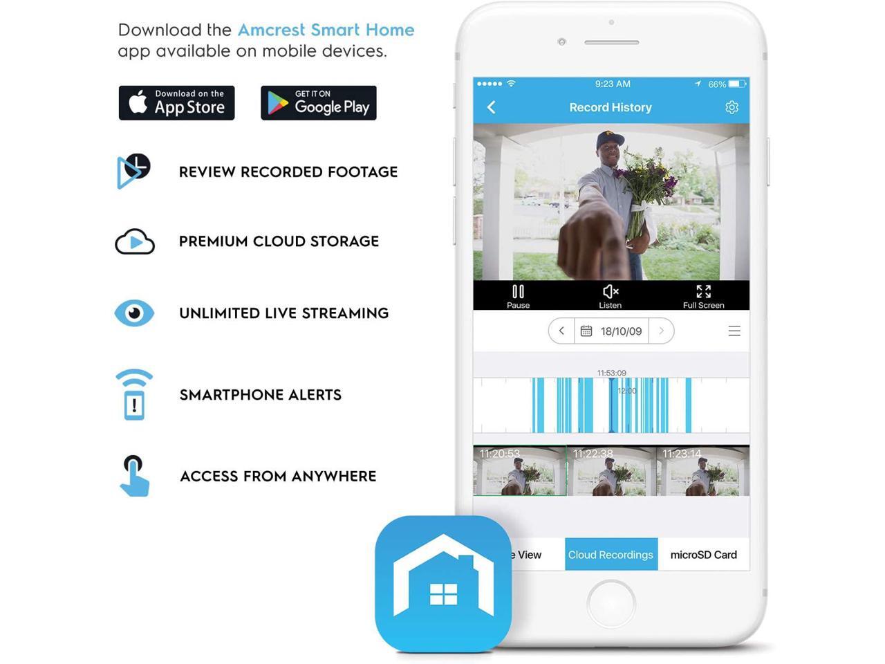 - Receive motion detection alerts via email or push notifications & instantly review recorded footage directly from your smartphone using the Amcrest Smart Home app. Securely store your HD footage to the Amcrest Smart Home Cloud or store directly to a class 10 MicroSD card up to 128GB. (MicroSD Card Not Included, Limited compatibility with Amcrest View Pro, Not compatible with Amcrest Cloud).
