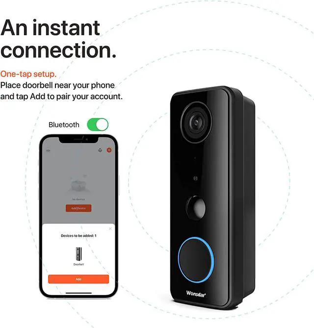 One-tap ConnectionThe upgraded 2022 doorbell camera has been distinguished by a one-tap connection feature compared with the connection mode of scanning code of the traditional doorbell. No need a series of cumbersome steps such as scanning the code, but only put your phone close to the doorbell to binding account. Just like your earphones connect magically to your phone. No more connection complications for you! (Please turn on the human detection switch on the app )