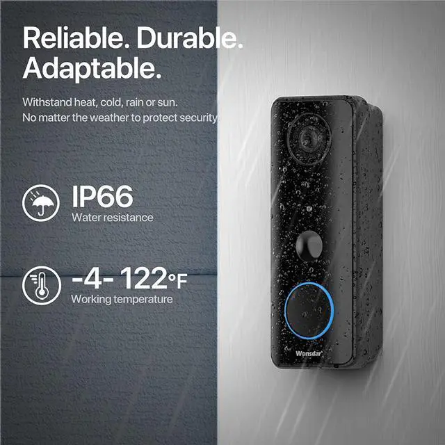 Reliable. Durable. AdaptableThe door bell shell made of industry-leading materials contributes to outdoor doorbells characteristics of working fit in -4°F~122°F. doorbell camera adopts a new generation of sealing technology to realize real IP66 waterproof, fully resisting to hot, cold, stormy and snowy weather.
