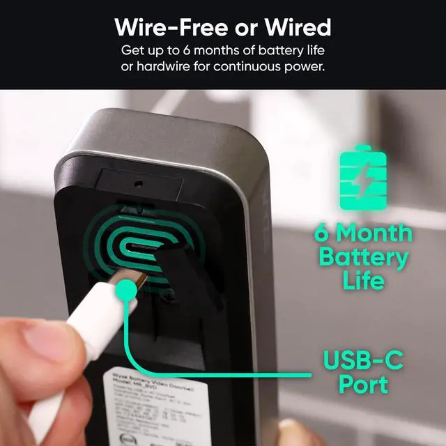 Wire-Free or Wired: Up to 6 months battery life or continuous power via hardwiring. Built-in USB-C rechargeable battery allows easy charging by detaching and connecting to the included USB-C Charging Cable. Note:You can enable 24/7 local recording when you add a Micro SD card (sold separately) and set up the doorbell with hardwired power.