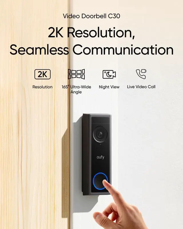 Video Doorbell Camera C30, Battery Powered,2K FHD,165° Ultra-Wide View,Easy Installation, Live Video Call, AI Human Detection for People and Packages,HomeBase 3 Compatible,No Monthly Fee