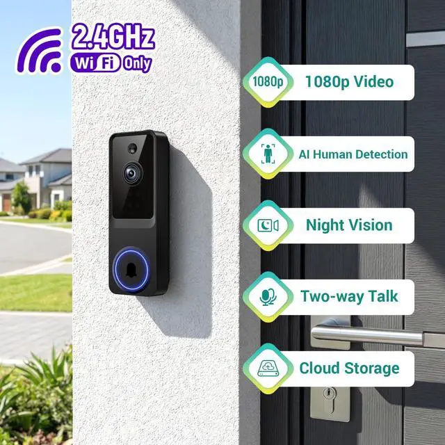 1080P Smart Wireless Video Doorbell Camera with AI Motion Detection, Night Vision, Two-Way Talk, Cloud Storage, Battery Powered, 2.4GHz Wi-Fi