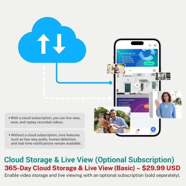 Keep your recordings safe with secure cloud storage. Enjoy a 3-day free trial to record, playback, and share footage.