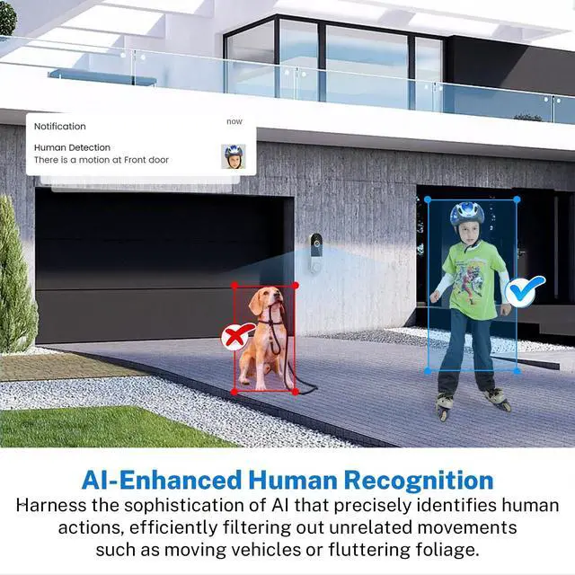- AI-Enhanced Notifications for Smarter Alerts: Avoid constant interruptions with AI-driven motion alerts that only notify you when human activity is detected. Perfect for any wireless doorbell camera system that needs to stay focused on what matters.