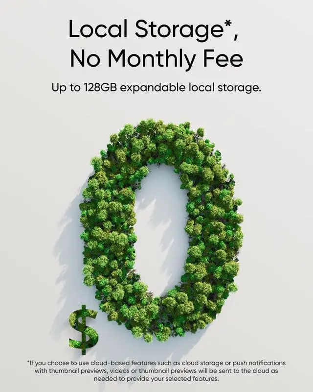 Footage is stored locally with a microSD card (not included) up to 128 GB with no subscription fee. With Homebase S380 (sold separately), you can enjoy up to 16TB of expandable storage, keeping your privacy securely in your hands.
