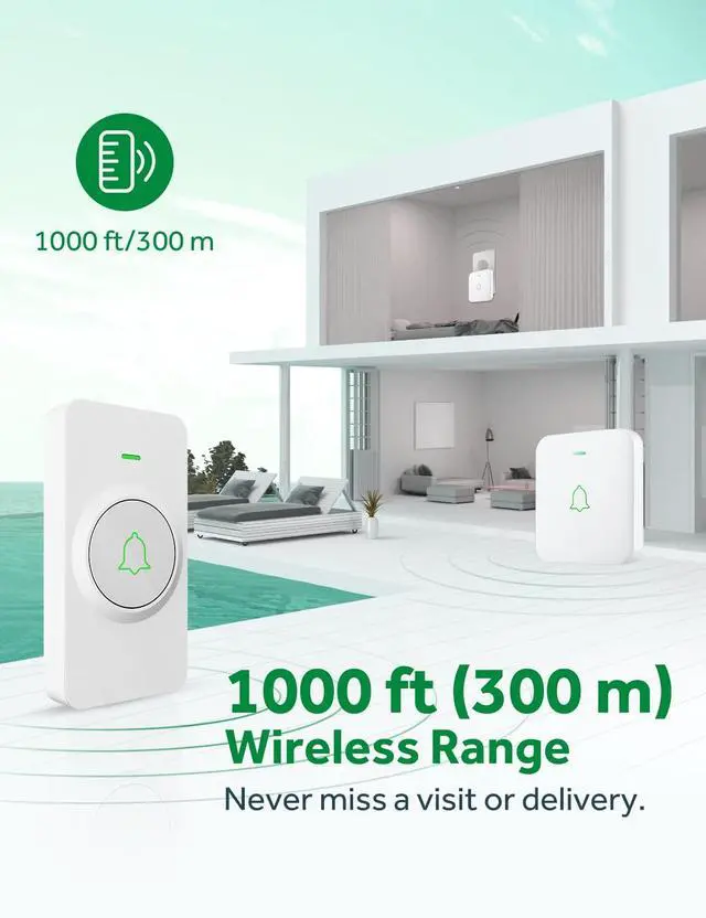 With a reliable wireless range of 1,000 feet and strong signal penetration, the doorbell will never fail to alert you when someone shows up at the door. Enjoy a reliable and hassle-free doorbell system at home, in factories, offices, classrooms, apartment blocks, villas, and other large areas.