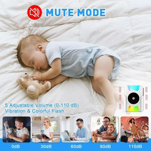 Adjust the sound to mute and be alerted by vibration and colorful light flashes, so you won't wake up a sleeping baby or worry about missing visitors.
