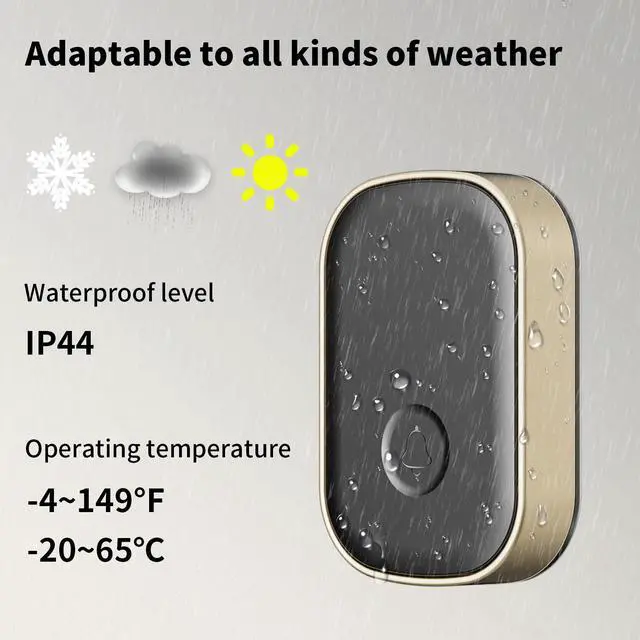 The wireless doorbell operates from -4 °F to 149 °F, is IP44 waterproof, and has a unique drainage structure that allows it to function properly in varying weather conditions.