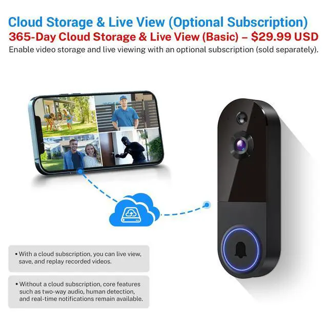 With a cloud subscription, you can live view, save, and replay recorded videos. Without a cloud subscription, core features such as two-way audio, human detection, and real-time notifications remain available.