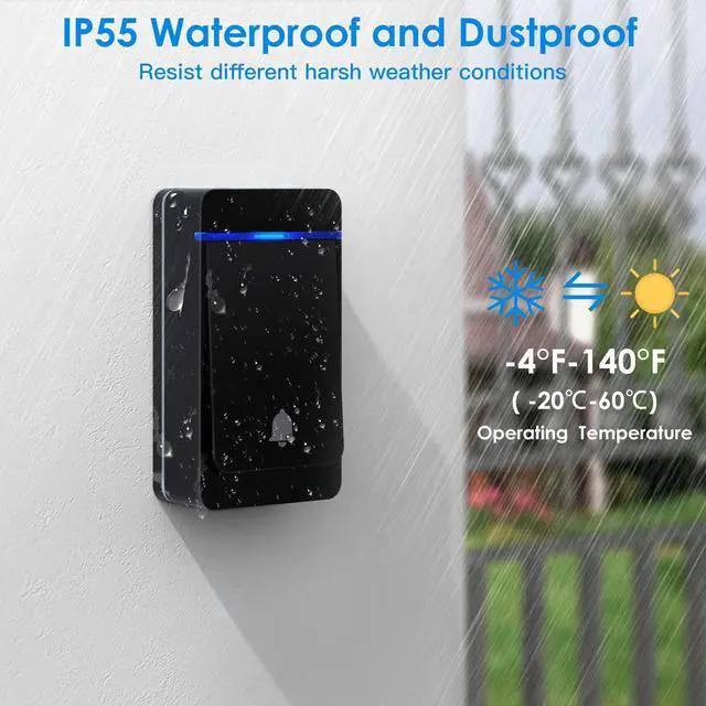 Door bell ringer wireless transmitter has a high dustproof and waterproof rating of IP55 protection makes it fearless of rain. Doorbell push button works temperature -4°F - 140°F (-20? - 60?), withstand various harsh weather conditions, you can install it anywhere inside, outside door frame or in your garden. It will never miss a visitor or a package.