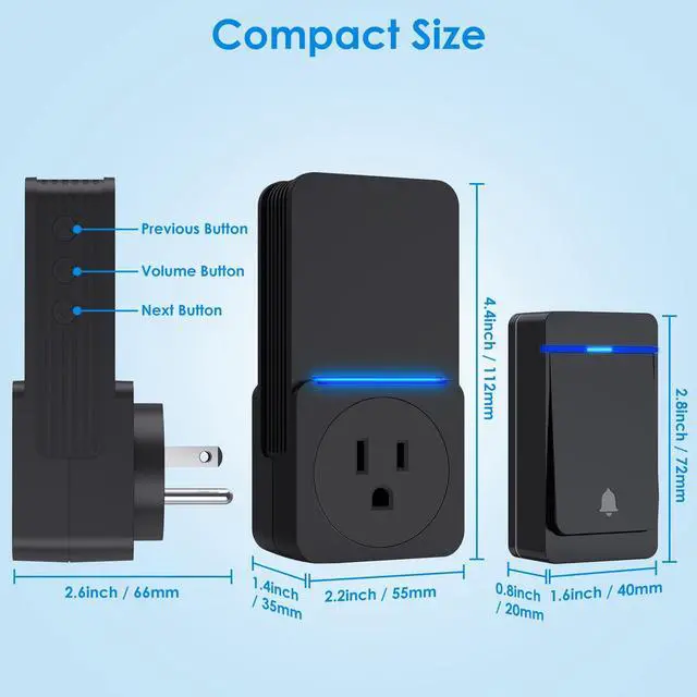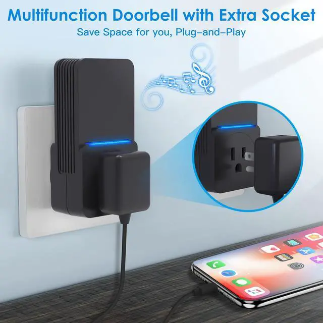 Plug in doorbell with an external outlet is easy to use, plug-and-play. It not only dose not take the outlet position, but also can be used as a outlet, provide power for mobile phones, tablets, television and other equipment. it supports a maximum power of 1200W. This wireless doorbell no battery powered required is convenient choice for your home and business.