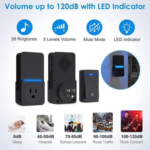 - Self-powered wireless doorbell receiver offers 38 melodies and 5 adjustable volume levels from 0dB to 120dB to meet your needs for different occasions. Blue led flashing light is friendly for the elderly and hearing impaired. The wireless doorbell chime kit can be given as a gift to your family or friend.
