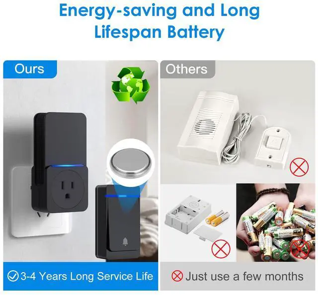 The doorbell push button uses an energy-saving 3V CR2032 lithium battery with an ultra-long lifespan of 3-4 years, ultra-low power consumption, wireless doorbell can be used without battery, when you press the button, the transmitter is powered like a perpetual motion machine, so you save the trouble of battery replacement frequently.
