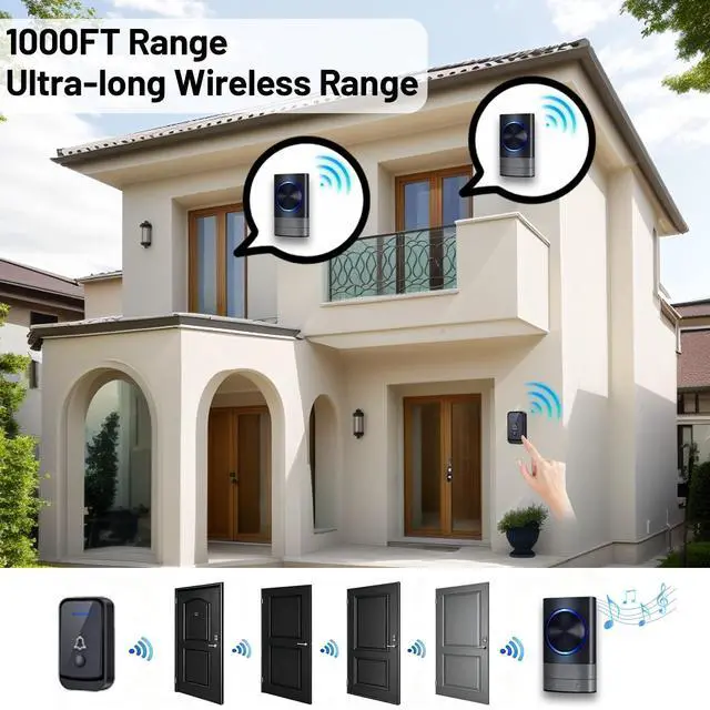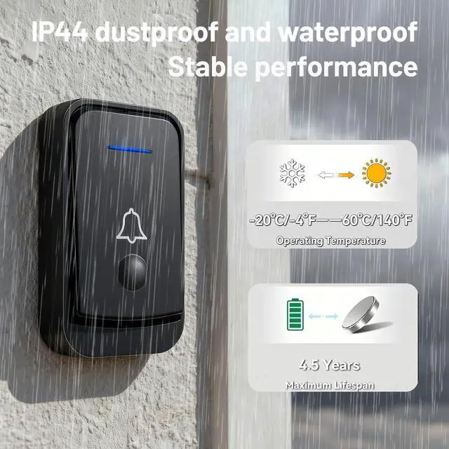52 Melodies, 4 Volume Levels: This wireless doorbell features 52 melodious chimes from around the world, switchable with a single button. It offers four adjustable volume levels (including silent mode) and incorporates a blue flashing light that remains active even in silent mode, catering to diverse needs.