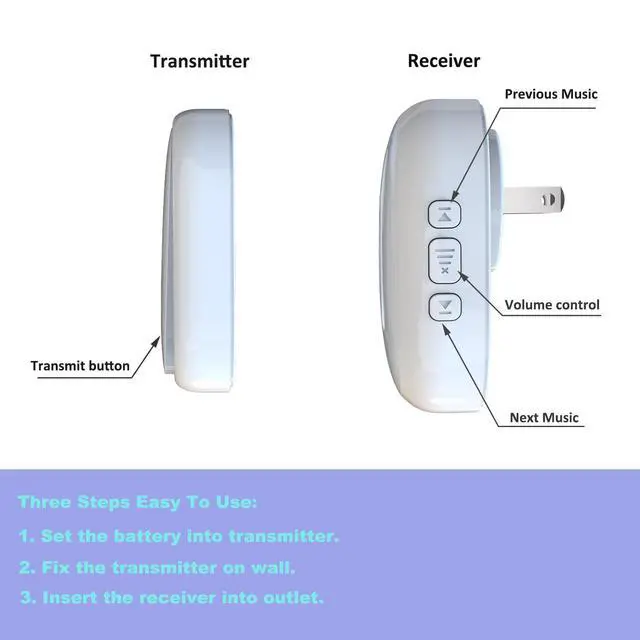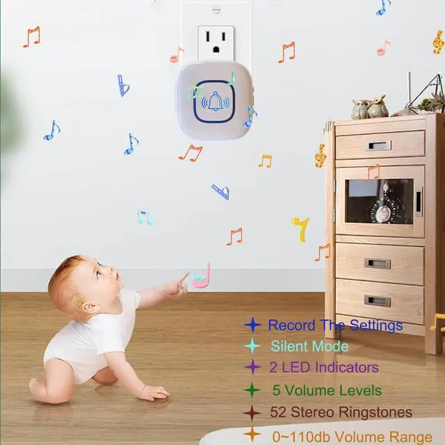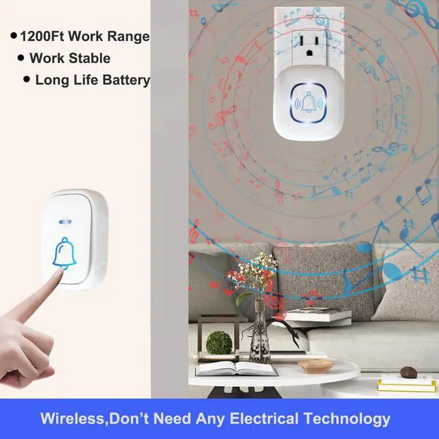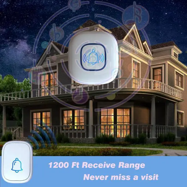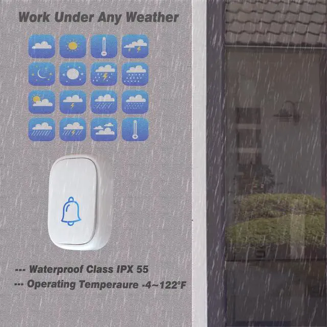 UNIONOW Wireless doorbell make your more convenience ! Features - Product name :UNIONOW Wireless Doorbell - Color : White - Advantage : More convenient for visitorsWork Stable - Strong wall through and stable signal, advanced intelligent technology ensures signal output.Easy to transmit signal through wooden doors, metal doors, exterior walls, stone walls and brick walls. - Weatherproof design : It can be used in rainy days, safe and durable. - Waterproof grade : Waterproof IP44(Suitable for outdoor use) - Working temperature : -4~149 - Wireless range : Up to 1,000 ft in open area - 52 ringtones options, choose your favorite music freely. 5 volume levels including silent mode, and the volume can reach 110 DB. - The sound is loud and crisp, friendly for people with hearing disabilities at home. - Blue LED x2 Flash Indicators - 2 blue indicators flashing will be more convenient and obvious to know visitor arrival. Package - Doorbell receiver X 1pcs - Transmitter X 1pcs - Sticker X 1pcs& Screws X 2pcs little screw for battery setting X1pcs - 23A 12V Alkaline battery for transmitter X 1pcs - Doorbell Instruction X 1pcs