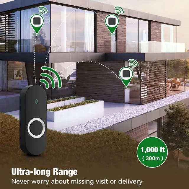 Operating range of up to 1000 Ft/305m. ensures you to hear and answer the doorbell in time.