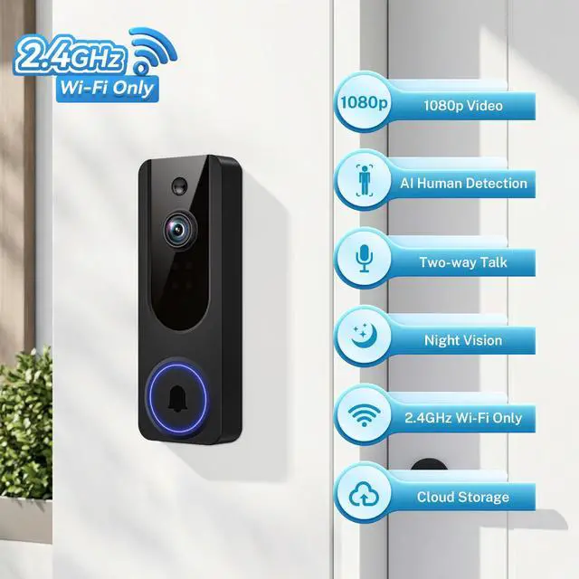 1080p Wireless Wi-Fi Video Doorbell Camera, Battery Powered, Night Vision, 2-Way Talk, Cloud Storage