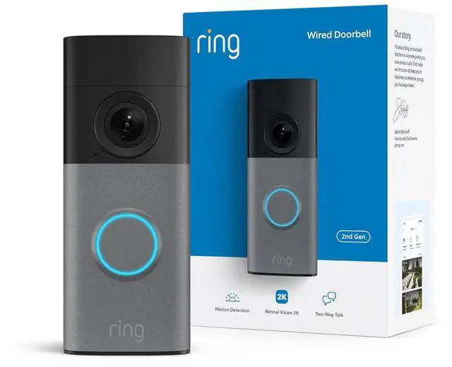 Experience advanced home security with the Wired Doorbell featuring Retinal 2K resolution and a wide-angle lens in a refined Speckled Gray finish. This newest model delivers exceptional clarity, allowing you to zoom in up to 6x for detailed viewing, ensuring you never miss important activity at your door. Real-time Live View and Two-Way Talk enable seamless communication with visitors, while instant motion alerts are sent directly to your phone for proactive monitoring. The device is powered by your existing electrical wiring, providing continuous operation without the need for batteries. For enhanced protection, access AI-powered alerts and video history with a compatible Ring Protect subscription (sold separately). Integration with Alexa-enabled devices offers hands-free control, custom notifications, and video access via Echo Show for a comprehensive smart home experience.