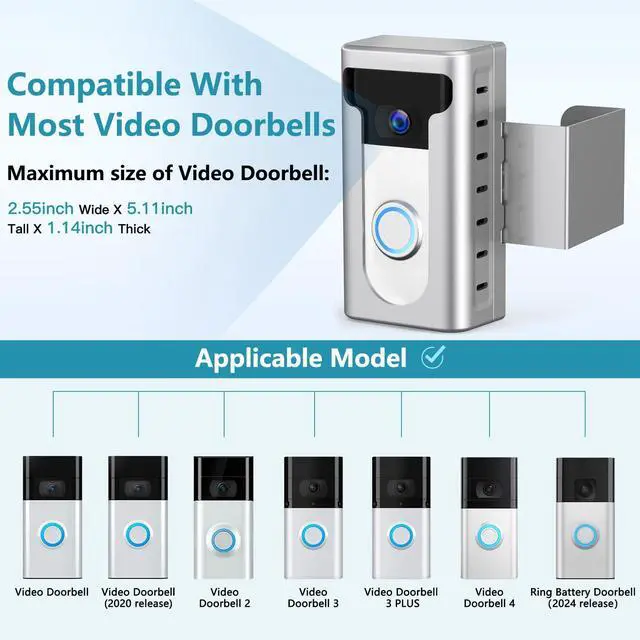 Compatible DoorbellsThe doorbell mount is compatible with Video Doorbell /2 /3 /3 Plus /4 /(2020 Release)/ Battery Doorbell Plus. The size of the doorbell that can be placed inside is not more than 2.55inches Wide x 5.11inches High x 1.14inches Depth. (Doorbell is Not Included in Package!)
