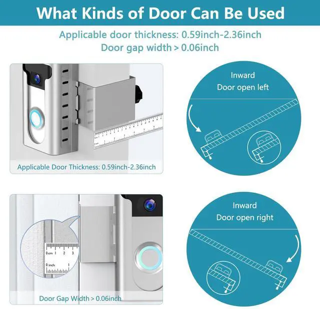 Compatible Doors The doorbell mount is suitable for most opened inward doors. The thickness of the door must be between 0.59 inches and 2.36 inches. Door Gap With must be more than 0.06 inches. The Edge of the door must be flat. (Note: Please check your door before buying!)