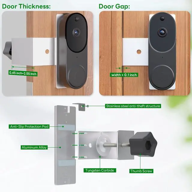 Door Type CompatibilitySuitable for most standard inward-swing doors (left- or right-handed). Your door's thickness must be less than 2.17 inches (5.5 cm), and the gap between the door and frame must be greater than 0.047 inches (1.2 mm). Please note: This Orbitell doorbell camera mount is not compatible with security doors, heavy-duty metal doors, or doors with uneven/non-standard edges.