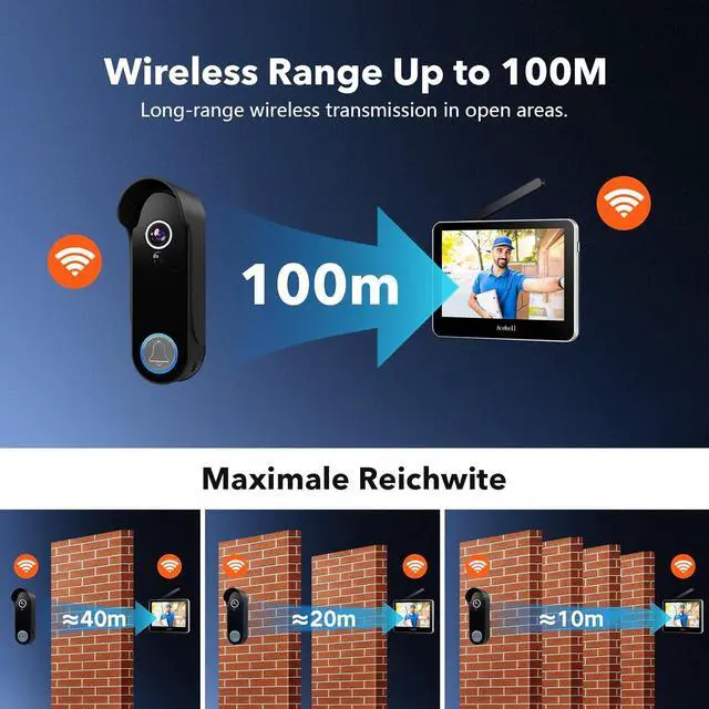 % , No need to connect any wires after unpacking. This system adopts private protocol transmission as its own signal, and can work with or without WiFi. It has better penetration performance, which can penetrate about 2 walls( - ). The actual signal performance depends on the usage environment. install the doorbell camera on a metal door, as metal is the strongest interference to wireless signals.