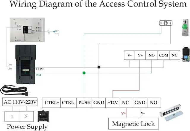 Complete Smart Door Access Kit - Includes a 1080P video doorbell camera, 7" IPS touch screen monitor, 600lb magnetic lock, power supply controller, exit button, remote control kit, and power cord - everything you need for a secure smart entry system.