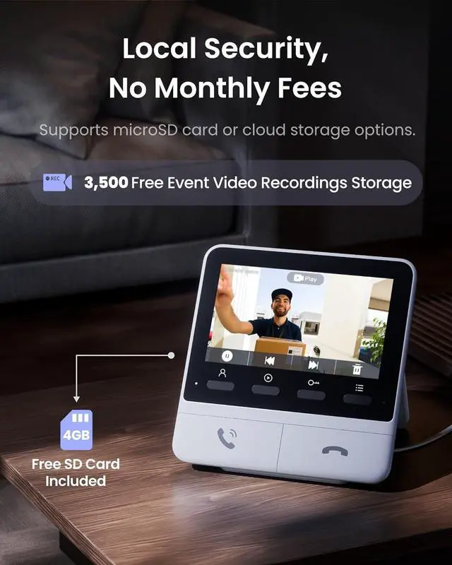No monthly fees and data protection: video doorbell with monitor contains a free 4GB SD card for secure local storage - without subscription. Supports SD cards up to 512GB as well as optional cloud storage with 30 days of free trial access for new customers.