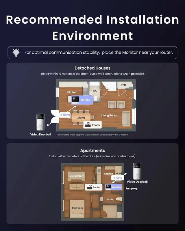 Installation instructions for the monitor: the monitor requires a power cable. Keep the indoor monitor and exterior doorbell as close as possible. A strong and instant connection is ensured when the doorbell and indoor monitor are within a radius of 5 metres. This will ensure that your live video broadcast works smoothly and you are notified immediately.