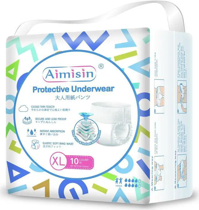 • ULTRA THIN INSTANT ABSORPTION- Unique Aimisin adult incontinence underwear design is thin and body-contoured, featuring anti-leak guards and an ultra-absorbent core. Incontinence underwear with super-absorbent integrated core locks in moisture away from the skin to help maintain comfort and skin health.