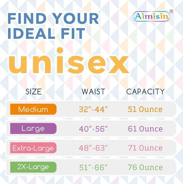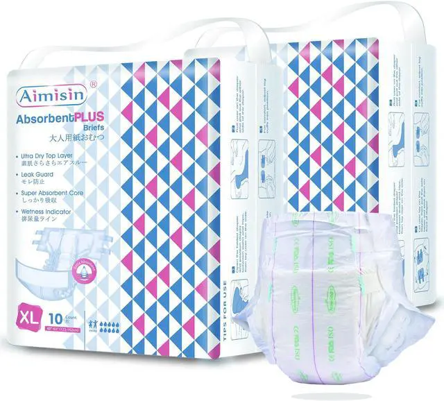 • Super Absorbency: Aimisin adult diaper contains more SAP than common diapers, its heavy absorbent gel core can quickly lock fluid away. So you can change it less frequently than your traditional briefs. Capacity: Medium(50 Ounce), Large(60 Ounce), Extra-Large(71 Ounce), Extra Extra-Large(76 Ounce)