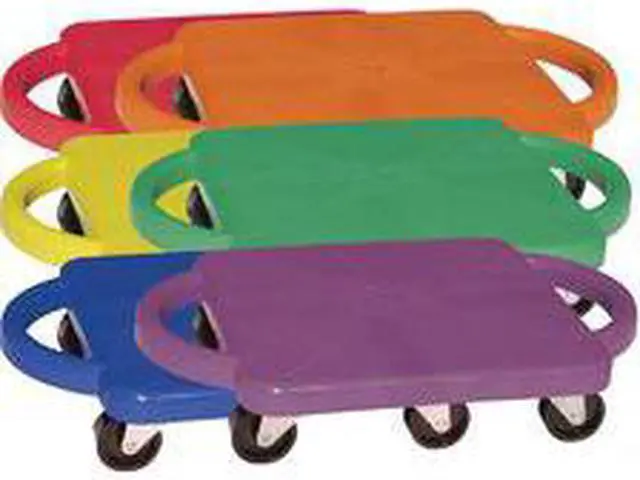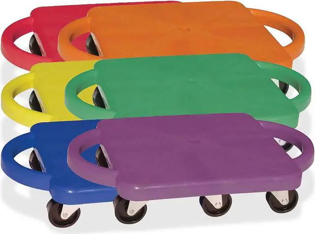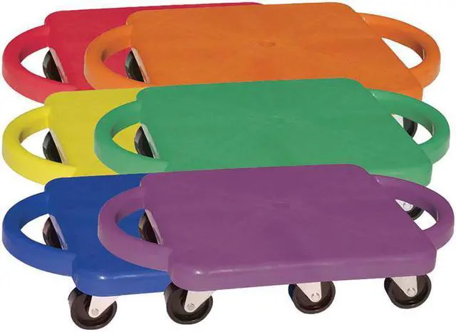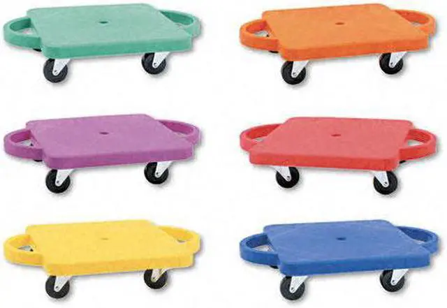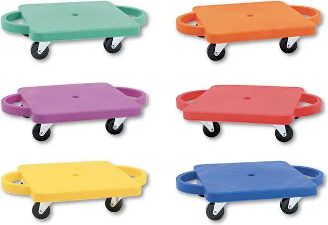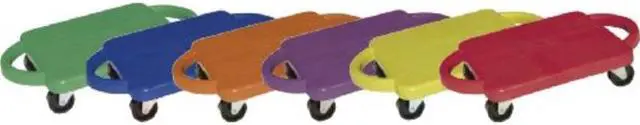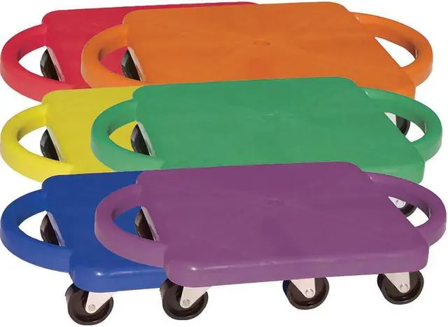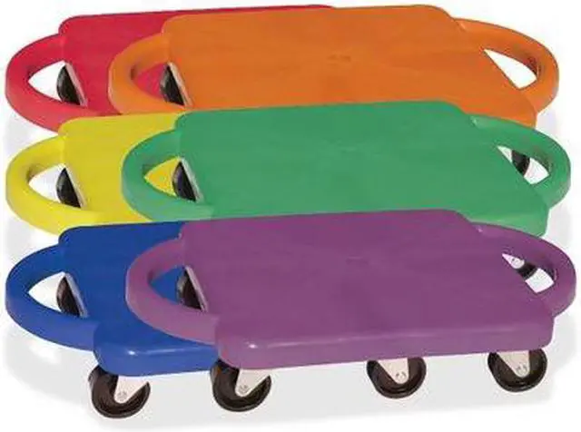 EChampion Sports Standard Scooter Set w/Handles - Blue, Green, Orange, Red, Yellow, Purple - PlasticE EPlastic scooters with handles promote balance, strength and creativity in a fun recreational activity. Scooters can be used in a seated, kneeling or prone position to play scooter hockey, create a scooter train and more. Easy-grip handles are comfortable to use and prevent you from sliding off. Nonmarring casters protect the finish of your play surface. E