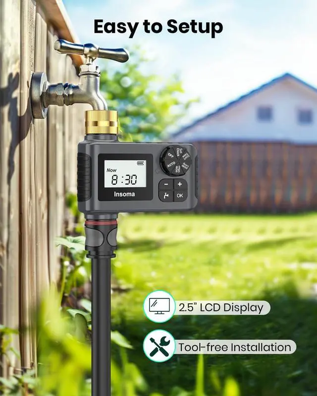 Long-lasting & Durable Insoma water hose timer is made of IP55 waterproof material and added a seal ring in the battery cover to isolate moisture. The material of hose timer's connector is added 35% fiber, which can withstand high water pressure from 7.25 psi to 116 psi. Each sprinkler timer is equipped with an additional reducing hex bushing (3/4" Male NPT to 1/2" Female NPT) and thread seal tape to fit different size hoses or faucets to prevent it from leakage.