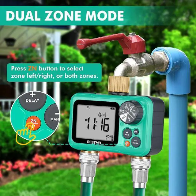 Easy To UseRotate the oversized dial to set clock, start time, how long and how often for all the 3 programs. Rotate it to ON and your programs automatically run. Long press manual button can water manually and manual watering will not interrupt preset programs. Long press delay button can delay the program and save water in rainy days. The large LCD display (2.5) is easy to read.