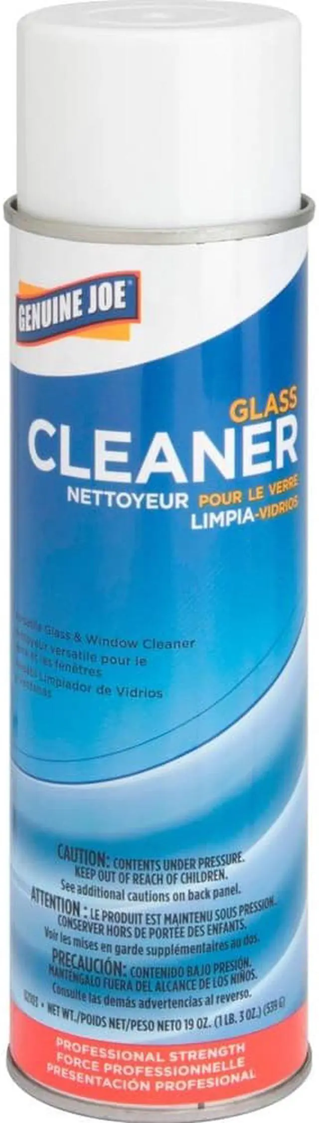 - Glass cleaner in an aerosol container offers professional strength. Ready-to-use, nonstreaking, nonammoniated cleaner can be used on most surfaces even Plexiglas. It quickly penetrates grease, grime, smoke and other soils on glass, windows, mirrors, tile, countertops, chrome and plastic surfaces. Glass cleaner leaves a clear, clean shine.