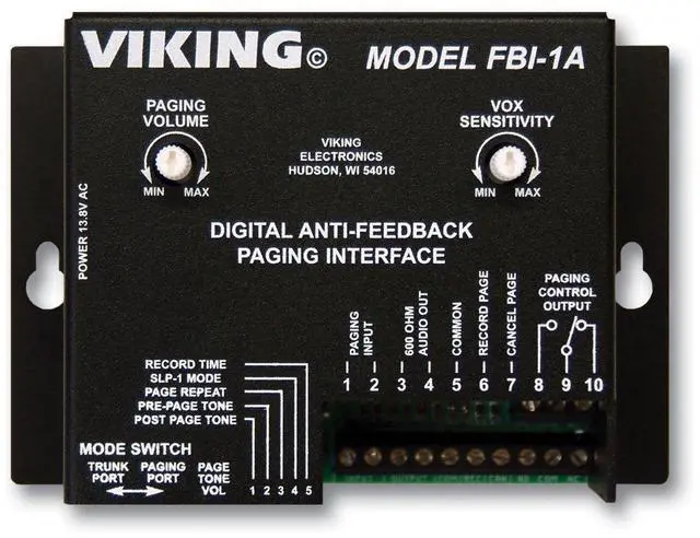 Viking Feedback Eliminator VK-FBI-1-A Now your paging amplifier can be turned up to any level and your phones can be located anywhere--even directly under a high-power paging horn. The "live" input from the paging port is digitally recorded. When complete, the paging amplifier is activated, a contact is provided, and the recorded page is repeated once or twice.