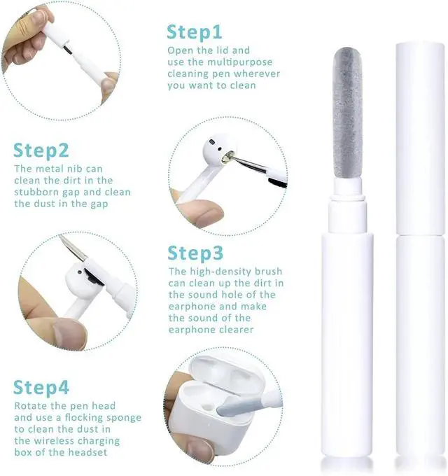 [Easy to use] Use the tip of the pen to clean the dust and debris in the Bluetooth headset box or the gap of the headset, and then use the high-density brush on the side to sweep away the scraped debris. The flocking sponge strip can clean the Bluetooth headset Debris and dust deep in the box.