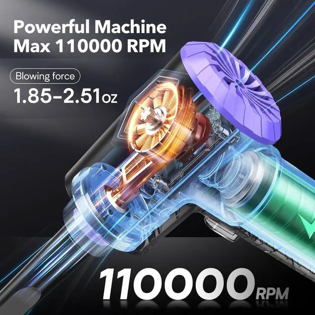 Compressed air duster is an innovative cleaning device that utilizes high-powered airflow to remove debris and dust from various surfaces. Unlike traditional canned air dusters, electric air duster is rechargeable, making it a cost-effective and sustainable cleaning solution. Our Anraye compressed air duster features a powerful air duster system that can produce a maximum speed of 110000 RPM and a blowing force of 1.85-2.51 oz.