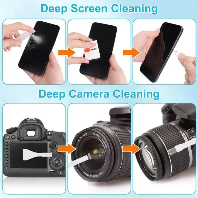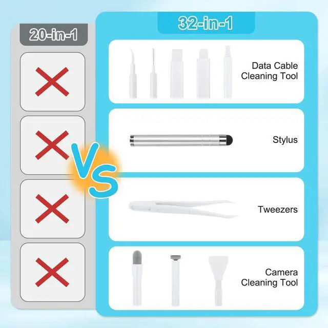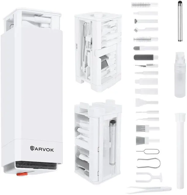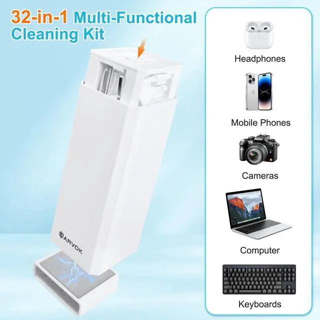 Upgraded 32 in1 Cleaning Kit: The keyboard cleaner kit comes with a variety of accessories. It can clean phone's charging port&speaker, screen, cameras, headphones, keyboard and computer. The main body that holds all accessories can even store SD card and sim card. Easily handle the different cleaning needs of electronic devices.