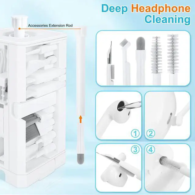 Headphones Clean Like New: Headphone cleaning pen with a metal tip can clean stubborn dirt, a mini brush cleans the earphone mesh; a round sponge brush and soft brush can clean the dust and dirt hidden in the deep of the charging case. There is an extended handle matches these accessories, making them easier to use.
