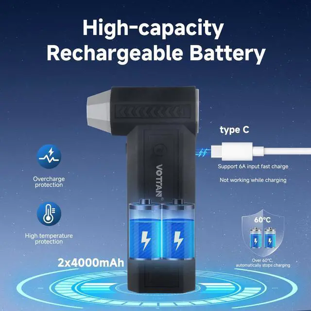 Fast Charging & Multiple Security: The electric duster with 2 pieces 4000mAh high capacity rechargeable batteries and type-C port, support 6A fast charging(The attached cable is not 6A, please use a fast charging cable). More importantly, safe and reliable multiple protection design: 60 overcharge protection, 80 overdischarge protection, overpressure protection, overcurrent protection, short circuit protection.