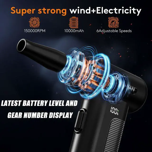 • 150,000 RPM & 6 GearThe air duster reaches up to 150,000 RPM. This enables effective removal of dust and debris. Additionally, it features 6 adjustable speed settings to meet diverse cleaning needs