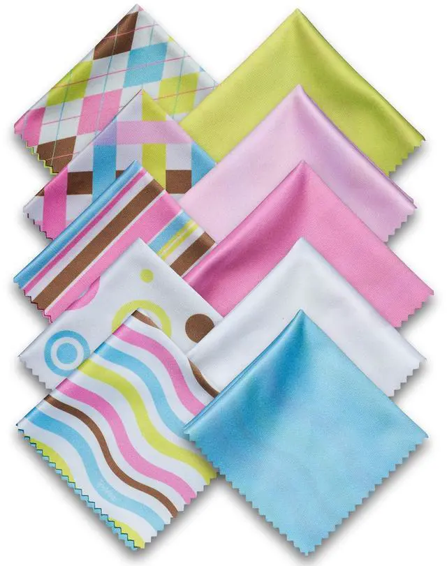 10 Pack Cute Geo-Design Multicolor Microfiber Cleaning Cloths for Cleaning Lenses, Eyeglasses, Sunglasses and Cell Phone, Beautifully Designed in Pastel Colors Blue, Pink, Green and White Cloth Wipes.